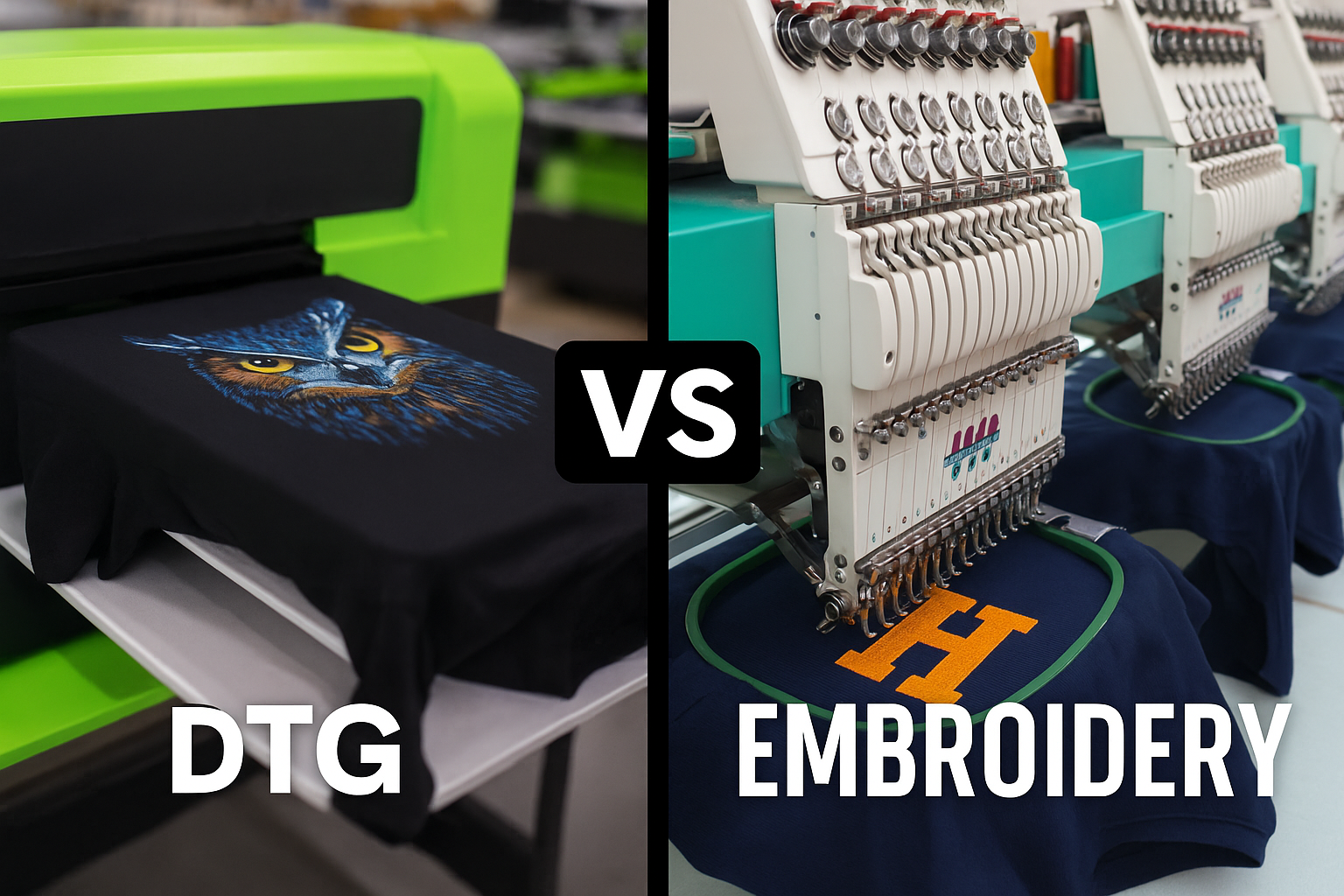 Embroidery provides a premium, textured finish perfect for uniforms. DTG provides a modern, retail-quality look that shines for promotional apparel and events.